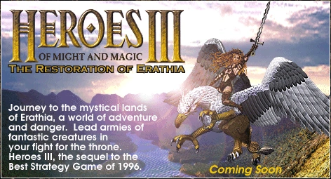 Heroes of Might and Magic III: The Restoration of Erathia (also known as Heroes III or HoMM3) is a turn-based strategy game developed by New World Computing for Microsoft Windows and released by the 3DO Company in 1999. An Apple Macintosh port was released by 3DO, and a Linux port was released by Loki Software, both later that year. In 2000, the Dreamcast port was cancelled. It is the third installment of the Heroes of Might and Magic series.