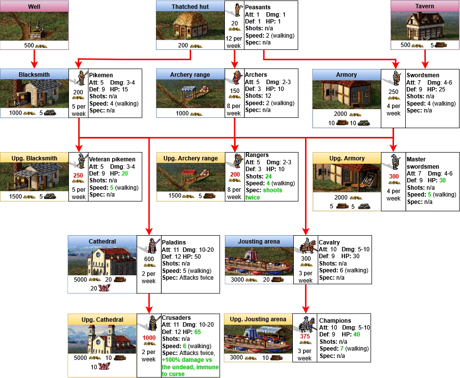 The Knight's creature dwellings are among the cheapest in Heroes II. Nevertheless the initial castle development is considerably slowed by the requirement of the well and the tavern for its tier 3 and tier 4 dwellings. Add to that the convoluted archery range upgrade requirements - it needs all tier 2-4 dwellings constructed first.