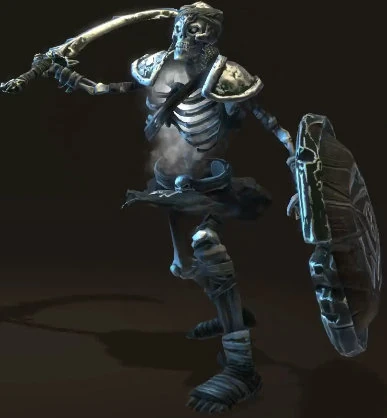 Skeletons are nothing more than dead, decaying bodies animated by the will of a Necromancer. Combining blind loyalty, indifference to hunger and thirst, and a lack of any sense of fear or doubt, the Skeleton is considered to be an excellent servant, using his sword and shield to bring death to the living.OffBck